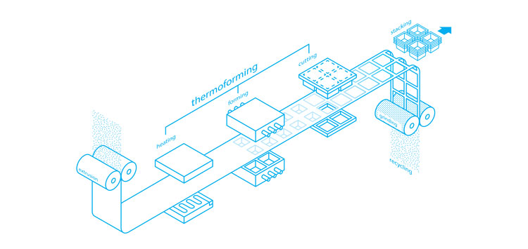 All of our plastic contains 30% of recycled plastic. (PET contains 30% PCW, PP contains between 35% and 50% PIW). During our thermoforming process we immediately recover our surplus and recycle it.